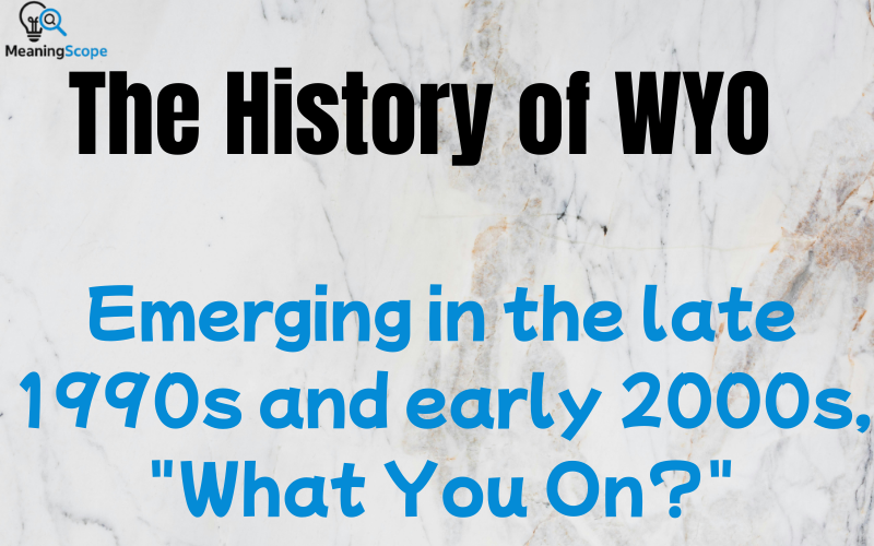 The roots of WYO trace back to urban slang in the United States, particularly in African American Vernacular English (AAVE), which has influenced much of modern internet lingo. Emerging in the late 1990s and early 2000s, “What You On?” was initially a verbal phrase used in face-to-face conversations among friends in cities like New York, Los Angeles, and Atlanta. It was a way to check in without being too formal โ€“ think hip-hop lyrics or street talk in movies like Boyz n the Hood (though we’re imagining the vibe, not linking to it). ๐ŸŽค