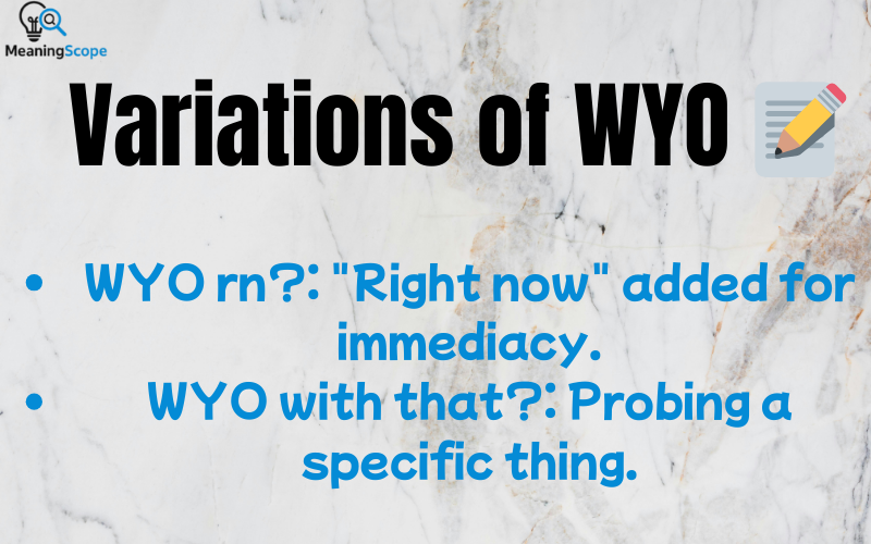 Synonyms include WYD, WUU2 (What You Up To?), or SUP (What’s Up?). WYO stands out for its “on” connotation, implying mindset over action.